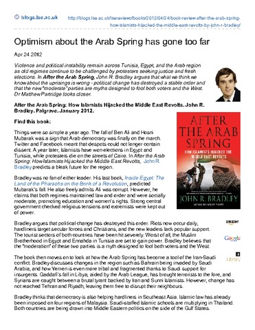 Violence and political instability remain across Tunisia, Egypt, and the Arab region as old regimes continue to be challenged by protesters seeking justice and fresh elections. In After the Arab Spring, John R. Bradley argues that what we think we know about the uprisings is wrong - political change has destroyed a stable order and that the new “moderate” parties are myths designed to fool both voters and the West. Dr Matthew Partridge looks closer. After the Arab Spring: How Islamists Hijacked the Middle East Revolts. John R. Bradley. Palgrave. January 2012.