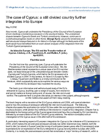 Book review: the case of Cyprus: a still divided country further integrates into Europe