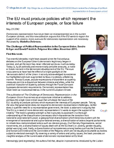 Democratic representation has never been so misrepresented as in the current European climate, and this new collection argues that if the EU wants to regain the support of its citizens, more avenues for democratic representation are necessary. Reviewed by Madalina Dobrescu. The Challenge of Political Representation in the European Union. Sandra Kröger and Dawid Friedrich. Palgrave Macmillan. November 2011.
