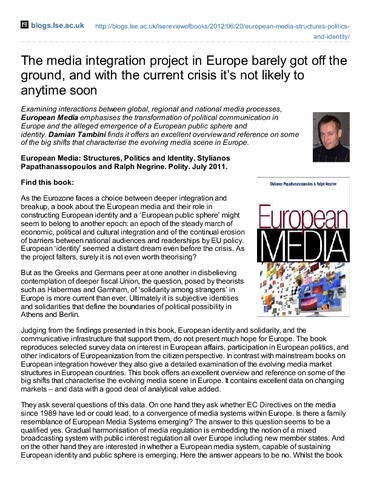Examining interactions between global, regional and national media processes, European Media emphasises the transformation of political communication in Europe and the alleged emergence of a European public sphere and identity. Damian Tambini finds it offers an excellent overview and reference on some of the big shifts that characterise the evolving media scene in Europe. European Media: Structures, Politics and Identity. Stylianos Papathanassopoulos and Ralph Negrine. Polity. July 2011.