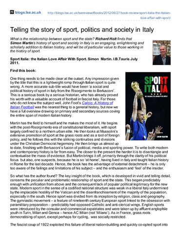 What is the relationship between sport and the state? Richard Holt finds that Simon Martin’s history of sport and society in Italy is an engaging, enlightening and scholarly addition to Italian history, and will be of particular value to those working in the history of sport.