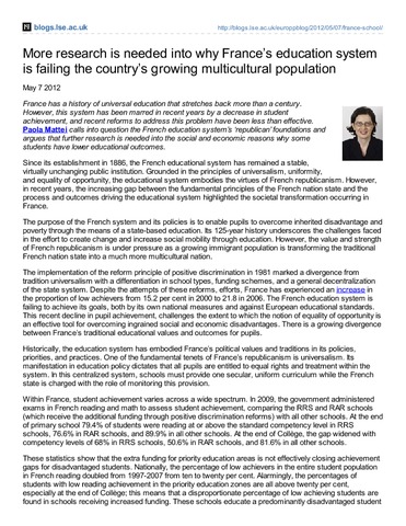 France has a history of universal education that stretches back more than a century. However, this system has been marred in recent years by a decrease in student achievement, and recent reforms to address this problem have been less than effective. Paola Mattei calls into question the French education system’s ‘republican’ foundations and argues that further research is needed into the social and economic reasons why some students have lower educational outcomes.
