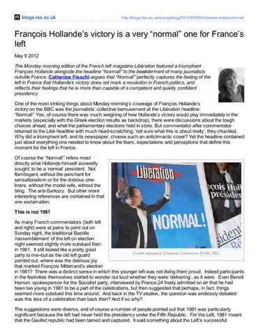 The Monday morning edition of the French left magazine Libération featured a triumphant François Hollande alongside the headline “Normal!” to the bewilderment of many journalists outside France. Catherine Fieschi argues that “Normal!” perfectly captures the feeling of the left in France that Hollande’s victory does not mark a revolution in French politics, and reflects their feelings that he is more than capable of a competent and quietly confident presidency.