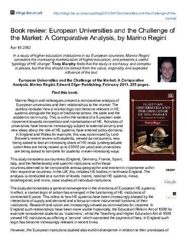 In a study of higher education institutions in six European countries, Marino Regini considers the increasing marketization of higher education, and presents a useful ‘typology of HE change’. Tony Murphy feels that the study is too heavy and complex in places, but that this should not detract from the value, originality and expected influence of the text.
