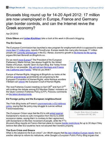 Brussels blog round up for 14-20 April 2012: 17 million are now unemployed in Europe, France and Germany plan border controls, and can the Internet revive the Greek economy?