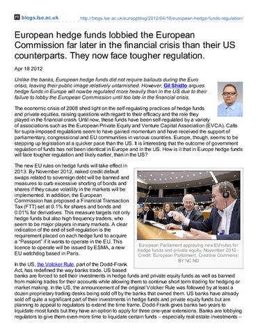 Unlike the banks, European hedge funds did not require bailouts during the Euro crisis, leaving their public image relatively untarnished. However, Gil Shidlo argues hedge funds in Europe will now be regulated more heavily than in the US due to their failure to lobby the European Commission until too late in the financial crisis.