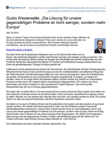 Guido Westerwelle: „Die Lösung für unsere gegenwärtigen Probleme ist nicht weniger, sondern mehr Europa“.