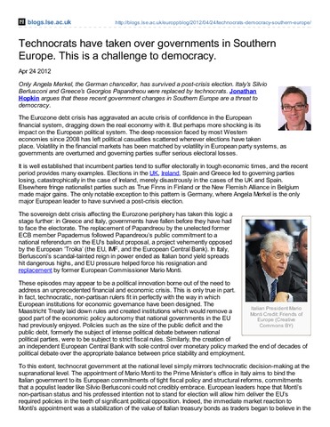 Only Angela Merkel, the German chancellor, has survived a post-crisis election. Italy’s Silvio Berlusconi and Greece’s Georgios Papandreou were replaced by technocrats. Jonathan Hopkin argues that these recent government changes in Southern Europe are a threat to democracy.