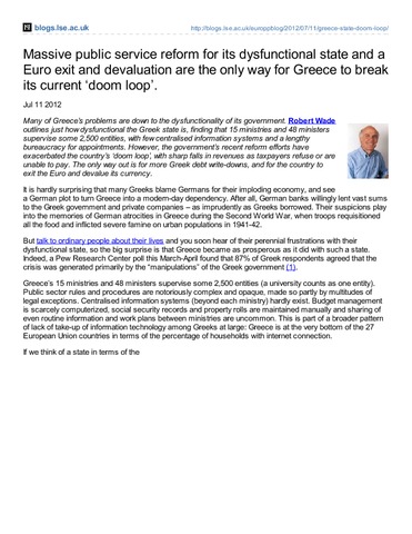 Many of Greece’s problems are down to the dysfunctionality of its government. Robert Wade outlines just how dysfunctional the Greek state is, finding that 15 ministries and 48 ministers supervise some 2,500 entities, with few centralised information systems and a lengthy bureaucracy for appointments. However, the government’s recent reform efforts have exacerbated the country’s ‘doom loop’, with sharp falls in revenues as taxpayers refuse or are unable to pay. The only way out is for more Greek debt write-downs, and for the country to exit the Euro and devalue its currency.