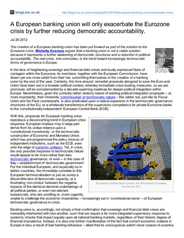 The creation of a European banking union has been put forward as part of the solution to the Eurozone crisis. Michelle Everson argues that a banking union is not a viable solution because it represents a further weakening of democratic structures and a reduction in political accountability. The real crisis, she concludes, is the trend toward increasingly technocratic forms of governance in Europe.