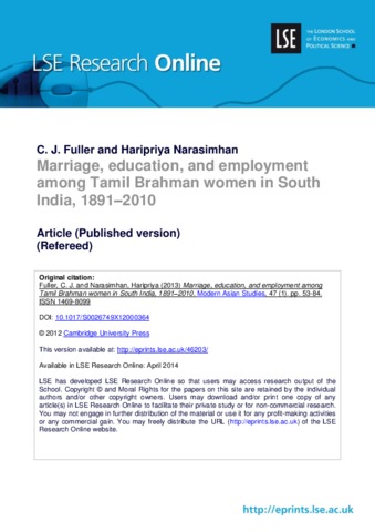 Marriage, education, and employment among Tamil Brahman women in South India, 1891–2010