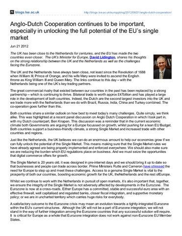 Anglo-Dutch cooperation continues to be important,especially in unlocking the full potential of the EU’s singlemarket