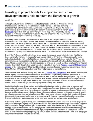 Although costly for public authorities, construction projects undertaken through the private finance initiative (PFI) tend to be well-managed on the private sector side, delivering predictably high returns to investors. Against this background, and despite the desire of policy-makers to invest in infrastructure, the sector is facing a severe credit crunch. Mark Hellowell argues that, while EU-backed project-bonds may offer a solution by allowing projects to be funded by institutional investors, they may undermine the very disciplines that have led to PFI’s impressive record of delivery.