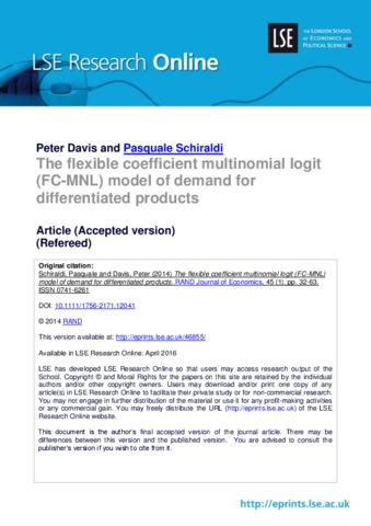 We show FC-MNL is flexible in the sense of Diewert (), thus its parameters can be chosen to match a well-defined class of possible own- and cross-price elasticities of demand. In contrast to models such as Probit and Random Coefficient-MNL models, FC-MNL does not require estimation via simulation; it is fully analytic. Under well-defined and testable parameter restrictions, FC-MNL is shown to be an unexplored member of McFadden's class of Multivariate Extreme Value discrete-choice models. Therefore, FC-MNL is fully consistent with an underlying structural model of heterogeneous, utility-maximizing consumers. We provide a Monte-Carlo study to establish its properties and we illustrate its use by estimating the demand for new automobiles in Italy.