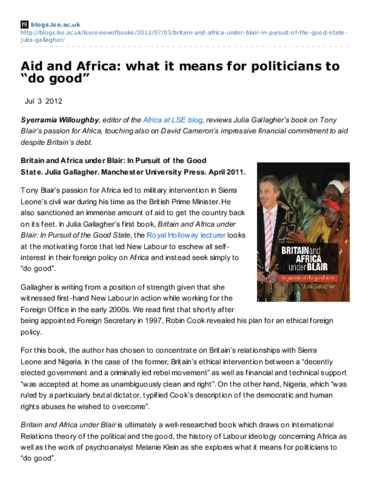 Syerramia Willoughby, editor of the Africa at LSE blog, reviews Julia Gallagher’s book on Tony Blair’s passion for Africa, touching also on David Cameron’s impressive financial commitment to aid despite Britain’s debt. Britain and Africa under Blair: In Pursuit of the Good State. Julia Gallagher. Manchester University Press. April 2011.