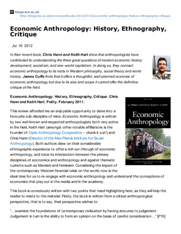 In their recent book, Chris Hann and Keith Hart show that anthropologists have contributed to understanding the three great questions of modern economic history: development, socialism, and one–world capitalism. In doing so, they connect economic anthropology to its roots in Western philosophy, social theory and world history. James Cuffe finds that it offers a thoughtful, well-planned overview of economic anthropology but due to its size and scope it cannot offer the definitive critique of the field. Economic Anthropology: History, Ethnography, Critique. Chris Hann and Keith Hart. Polity. February 2011.