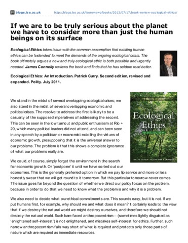Ecological Ethics takes issue with the common assumption that existing human ethics can be ′extended′ to meet the demands of the ongoing ecological crisis. The book ultimately argues a new and truly ecological ethic is both possible and urgently needed. James Connelly reviews the book and finds that he has seldom read better. Ecological Ethics: An Introduction. Patrick Curry. Second edition, revised and expanded. Polity. July 2011.