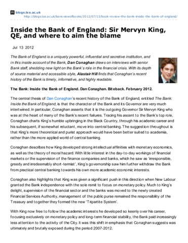 The Bank of England is a uniquely powerful, influential and secretive institution, and in this inside account of the Bank, Dan Conaghan draws on interviews with senior Bank staff, shedding new light on the Bank’s role in the financial crisis. With its depth of source material and accessible style, Alastair Hill finds that Conaghan’s recent history of the Bank is timely, informative, and highly readable. The Bank: Inside the Bank of England. Dan Conaghan. Biteback. February 2012.