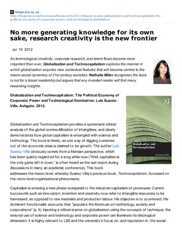 As technological creativity, corporate research, and talent flows become more important than ever, Globalization and Technocapitalism explores the manner in which globalisation acquires new contextual features that will become central to the macro-social dynamics of 21st century societies. Nathalie Mitev recognises the book is not for a broad readership but argues that any invested reader will find many rewarding insights. Globalization and Technocapitalism: The Political Economy of Corporate Power and Technological Domination. Luis Suarez-Villa. Ashgate. 2012.