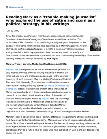 Since the onset of global crisis in recent years, academics and economic theorists have been drawn to Marx’s analysis of the inherent instability of capitalism. The rediscovery of Marx is based on his continuing capacity to explain the present. In the context of what some commentators have described as a “Marx renaissance”, the aim of this book, edited by Marcello Musto, is to make a close study of Marx’s principal writings in relation to the major problems of our own society, and to show why and how some of his theories constitute a precious tool for the understanding and critique of the world in the early twenty-first century. Reviewed by Nick Taylor. Marx for Today. Marcello Musto (ed.) Routledge. April 2012.