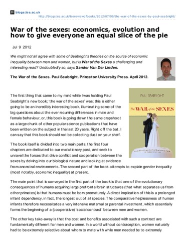 We might not all agree with some of Seabright’s theories on the source of economic inequality between men and women, but is War of the Sexes a challenging and interesting read? Undoubtedly so, says Sander Van Der Linden. The War of the Sexes. Paul Seabright. Princeton University Press. April 2012.
