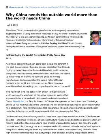 The rise of China preoccupies the global media, which regularly carry articles suggesting that it is using its financial resources to ‘buy the world’. Is there any truth to this idea? Or is this just scaremongering by Western commentators who have little interest in a balanced presentation of China’s role in the global political economy? Kent Deng recommends Is China Buying the World? for its breath-taking depth into the very heart of the global economic system that we currently live in. Is China Buying the World? Peter Nolan. Polity Press. May 2012.