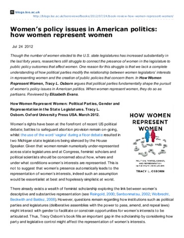 Though the number of women elected to the U.S. state legislatures has increased substantially in the last forty years, researchers still struggle to connect the presence of women in the legislature to public policy outcomes that affect women. One reason for this struggle is that we lack a complete understanding of how political parties modify the relationship between women legislators’ interests in representing women and the creation of public policies that concern them. In How Women Represent Women, Tracy L. Osborn argues that political parties fundamentally shape the pursuit of women’s policy issues in American politics. When women represent women, they do so as partisans. Reviewed by Elizabeth Evans. How Women Represent Women: Political Parties, Gender and Representation in the State Legislatures. Tracy L. Osborn. Oxford University Press USA. March 2012.