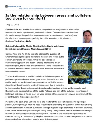 Opinion Polls and the Media provides a comprehensive analysis of the relationship between the media, opinion polls, and public opinion. The contributors explore how the media use opinion polls in a range of countries across the world, and analyses the effects and uses of opinion polls by the public as well as political actors. Reviewed by Anthony Wells. Opinion Polls and the Media. Christina Holtz-Bacha and Jesper Strömbäck (eds.) Palgrave Macmillan. April 2012.