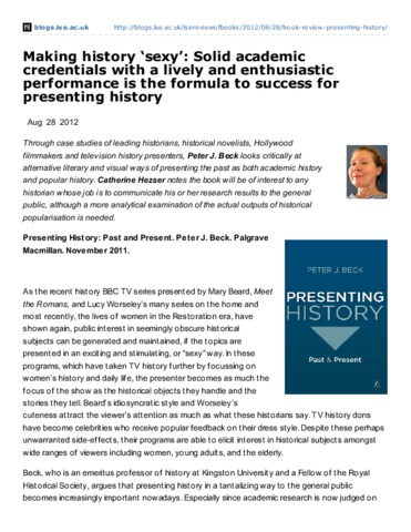 Through case studies of leading historians, historical novelists, Hollywood filmmakers and television history presenters, Peter J. Beck looks critically at alternative literary and visual ways of presenting the past as both academic history and popular history. Catherine Hezser notes the book will be of interest to any historian whose job is to communicate his or her research results to the general public, although a more analytical examination of the actual outputs of historical popularisation is needed. Presenting History: Past and Present. Peter J. Beck. Palgrave Macmillan. November 2011.
