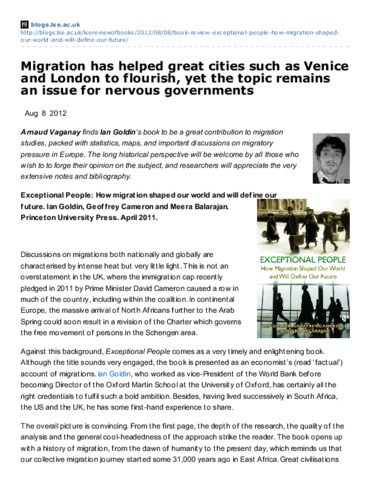 Arnaud Vaganay finds Ian Goldin‘s book to be a great contribution to migration studies, packed with statistics, maps, and important discussions on migratory pressure in Europe. The long historical perspective will be welcome by all those who wish to to forge their opinion on the subject, and researchers will appreciate the very extensive notes and bibliography. Exceptional People: How migration shaped our world and will define our future. Ian Goldin, Geoffrey Cameron and Meera Balarajan. Princeton University Press. April 2011.