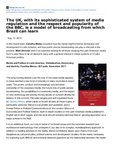 In this recent book, Carolina Matos considers how the media might enhance democracy and development in Latin America, and how public service broadcasting can play a vital part in the process. Mark Dinneen sees it as essential reading for all those studying the Latin American media, but it is also likely to be of interest to many with a general interest in media systems or in Latin American politics. Media and Politics in Latin America: Globalization, Democracy and Identity. Carolina Matos. I.B.Tauris. November 2011.