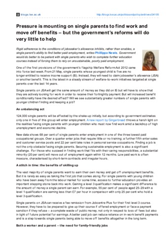 Rigid adherence to the conditions of jobseeker’s allowance inhibits, rather than enables, a single parent’s ability to find better paid employment, writes Phillippa Newis. Government would do better to be patient with single parents who wish to complete further education courses instead of forcing them to rely on unsustainable, poorly paid employment.