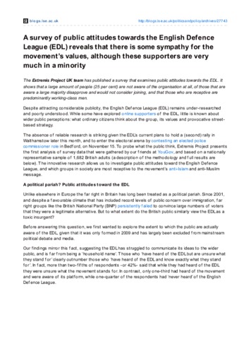 The Extremis Project UK team has published a survey that examines public attitudes towards the EDL. It shows that a large amount of people (25 per cent) are not aware of the organisation at all, of those that are aware a large majority disapprove and would not consider joining, and that those who are receptive are predominantly working-class men.