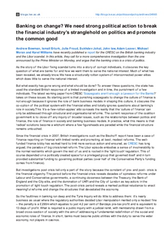 Andrew Bowman, Ismail Erturk, Julie Froud, Sukhdev Johal, John law, Adam Leaver, Michael Moran and Karel Williams have recently published a report for the CRESC on the British banking industry and the Libor scandal. In this article, they call for a more comprehensive investigation than the one announced by the Prime Minister on Monday, and argue that the banking crisis is a crisis of politics.