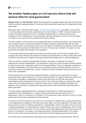 George Jones and John Stewart dismiss the Government’s new paper outlining their plan for civil service reform as another inadequate attempt. Civil-service reform should draw heavily upon the experience of local government.