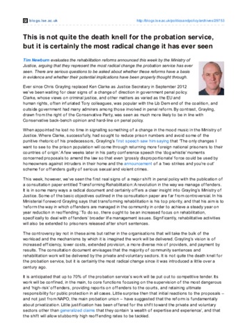 Tim Newburn evaluates the rehabilitation reforms announced this week by the Ministry of Justice, arguing that they represent the most radical change the probation service has ever seen. There are serious questions to be asked about whether these reforms have a basis in evidence and whether their potential implications have been properly thought through.