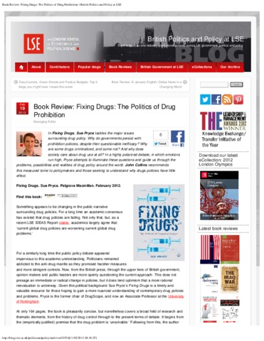 In Fixing Drugs, Sue Pryce tackles the major issues surrounding drug policy. Why do governments persist with prohibition policies, despite their questionable inefficacy? Why are some drugs criminalized, and some not? And why does society care about drug use at all? In a highly polarized debate, in which emotions run high, Pryce attempts to illuminate these questions and guide us through the problems, possibilities and realities of drug policy around the world. John Collins recommends this measured tome to policymakers and those seeking to understand why drugs policies have little effect.