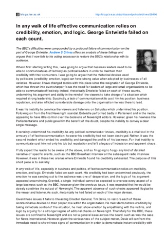 In any walk of life effective communication relies on credibility, emotion, and logic. George Entwistle failed on each count