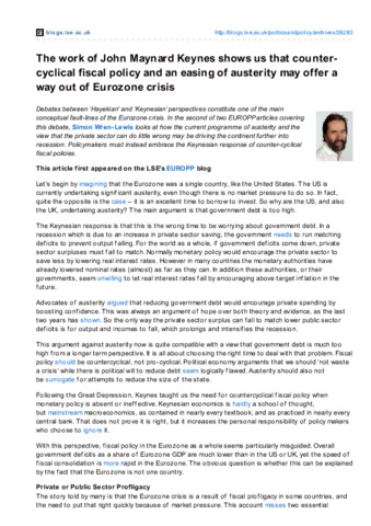 The work of John Maynard Keynes shows us that counter-cyclical fiscal policy and an easing of austerity may offer a way out of Eurozone crisis