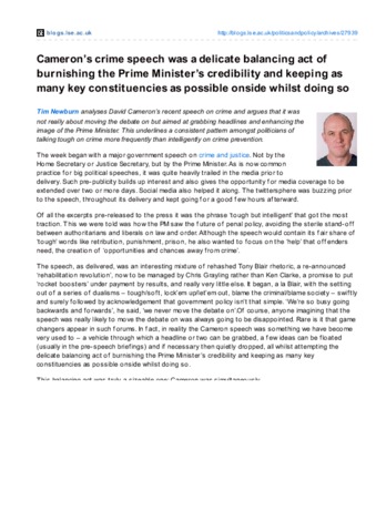 Tim Newburn analyses David Cameron's recent speech on crime and argues that it was not really about moving the debate on but aimed at grabbing headlines and enhancing the image of the Prime Minister. This underlines a consistent pattern amongst politicians of talking tough on crime more frequently than intelligently on crime prevention.