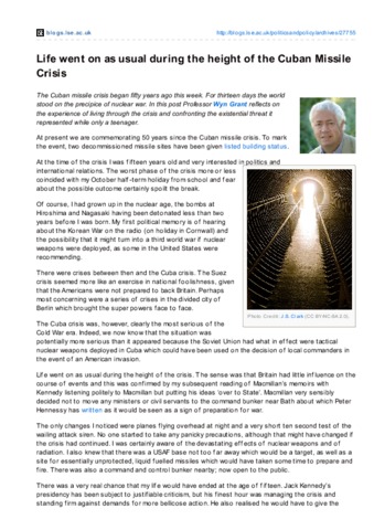 The Cuban missile crisis began fifty years ago this week. For thirteen days the world stood on the precipice of nuclear war. In this post Professor Wyn Grant reflects on the experience of living through the crisis and confronting the existential threat it represented while only a teenager.