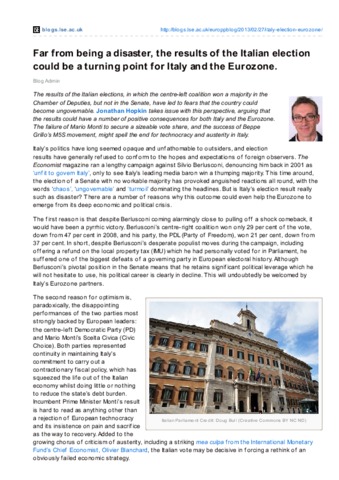 The results of the Italian elections, in which the centre-left coalition won a majority in the Chamber of Deputies, but not in the Senate, have led to fears that the country could become ungovernable. Jonathan Hopkin takes issue with this perspective, arguing that the results could have a number of positive consequences for both Italy and the Eurozone. The failure of Mario Monti to secure a sizeable vote share, and the success of Beppe Grillo’s M5S movement, might spell the end for technocracy and austerity in Italy.
