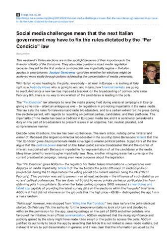 This weekend’s Italian elections are in the spotlight because of their importance to the financial stability of the Eurozone. They also raise questions about media regulation because they will be the first under a controversial new impartiality regime – that also applies to smartphones. Jacopo Genovese considers whether fair elections might be achieved more easily through policies addressing the concentration of media ownership.