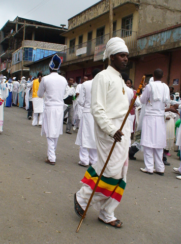 In center frame is an Ethiopian Orthodox deacon, festively dressed and leading choruses of popular devotional songs that are performed continuously all day. It is St. Michael's day and the public choir includes church singers from age five to thirty, clergy specialized in liturgical chant, acclaimed local soloists and anyone present in the general vicinity. Ways in which religious communities are incorporated as defined social structures, either formally or informally, staged or improvised, is the central investigation of this anthropological research. as it is initiated through such processions, dynamic because they meld markers of religious and secular worlds in such moments of collective charisma and promotes an inclusivity among Ethiopians of all walks of life.