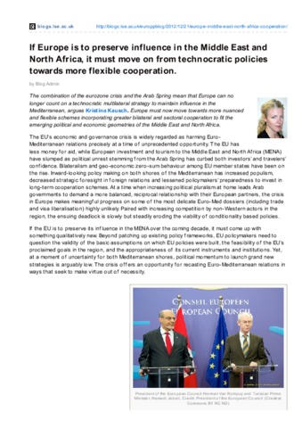 The combination of the eurozone crisis and the Arab Spring mean that Europe can no longer count on a technocratic multilateral strategy to maintain influence in the Mediterranean, argues Kristina Kausch. Europe must now move towards more nuanced and flexible schemes incorporating greater bilateral and sectoral cooperation to fit the emerging political and economic geometries of the Middle East and North Africa.