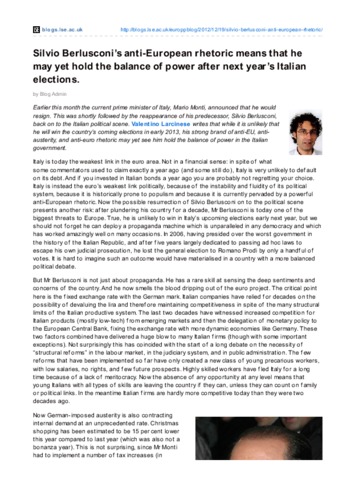 Earlier this month the current prime minister of Italy, Mario Monti, announced that he would resign. This was shortly followed by the reappearance of his predecessor, Silvio Berlusconi, back on to the Italian political scene. Valentino Larcinese writes that while it is unlikely that he will win the country’s coming elections in early 2013, his strong brand of anti-EU, anti-austerity, and anti-euro rhetoric may yet see him hold the balance of power in the Italian government.