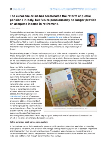 For years Italian workers have had access to very generous public pensions, with relatively early retirement ages, and until the crisis, strong interests and the fractious nature of Italian politics made pension reform near impossible. Leandro Carrera looks at the history of post-war pension reforms in Italy and finds that the eurozone crisis and influence from the EU have forced Italy to reform its public pensions system or face unsustainable budget deficits. However, with unemployment on the rise, meaning lower contributions, some may find that the new arrangements mean that their public pensions are simply not enough to live on.