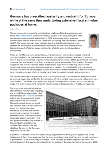 The eurozone crisis is one of the most significant challenges EU policymakers have yet faced. Waltraud Schelkle examines Germany’s reaction to the crisis, finding that while Germany proposed economic self-restraint in 2008, it also embarked on a policy of domestic fiscal stimulus to the welfare system and car industry that amounted to 3 per cent of GDP. She argues that hard times can often lead to a delicate balance being struck between the presentation of policies to the electorate on the one hand, and the need to balance the needs of interest groups on the other: what she terms the ‘dual politics of policymaking’.