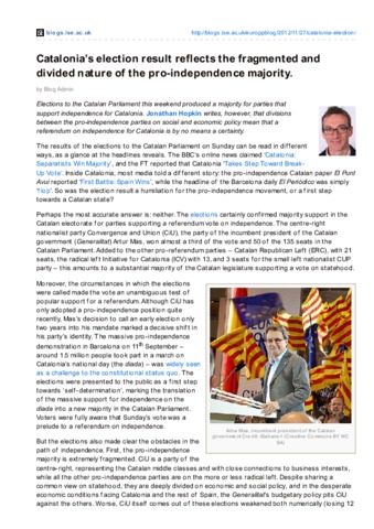 Elections to the Catalan Parliament this weekend produced a majority for parties that support independence for Catalonia. Jonathan Hopkin writes, however, that divisions between the pro-independence parties on social and economic policy mean that a referendum on independence for Catalonia is by no means a certainty.
