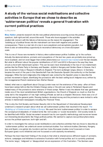 A study of the various social mobilisations and collectiveactivities in Europe that we chose to describe as‘subterranean politics’ reveals a general frustration withcurrent political practices.